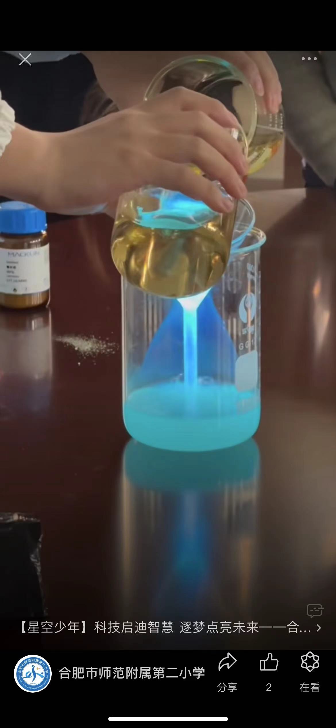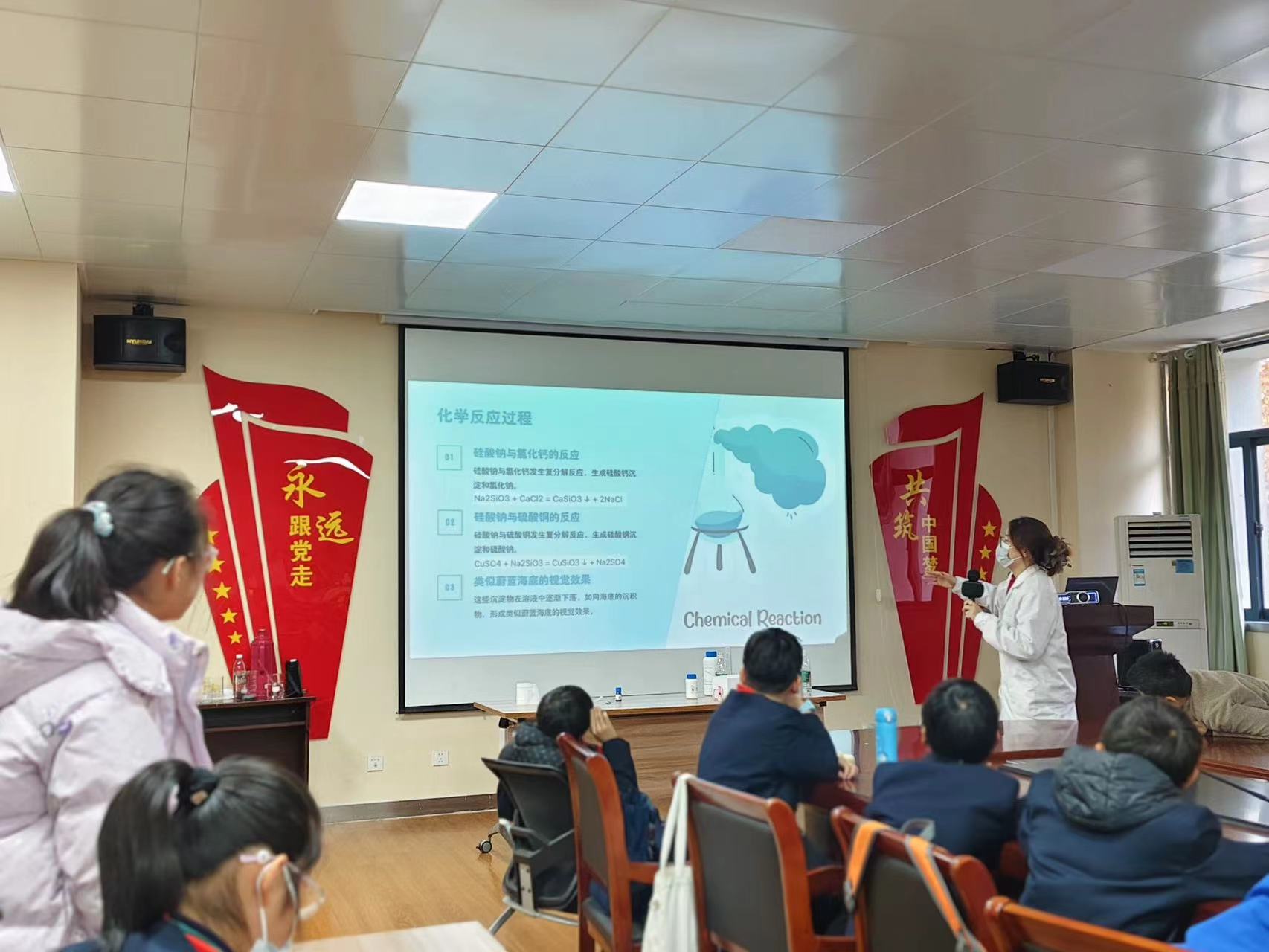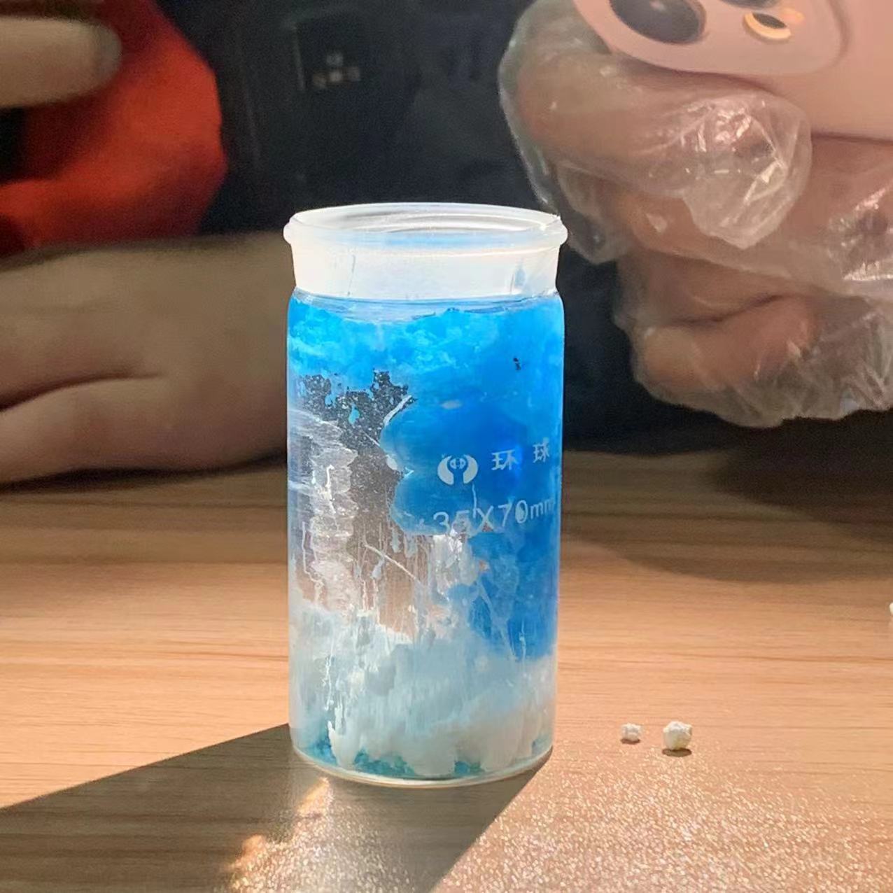 隨后,郎貝貝同學帶來的“蔚藍海底實驗”將大家帶入深邃的海洋世界。通過硫酸銅與硅酸鈉的化學反應,溶液中逐漸呈現出藍色漸變和沉積效果,仿佛海底的神秘景觀。大家驚嘆于化學變化創造的奇妙景觀,并對其中的化學原理產生了濃厚興趣。