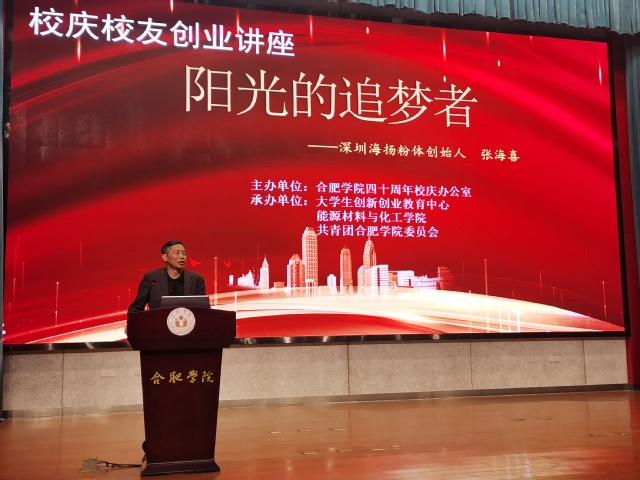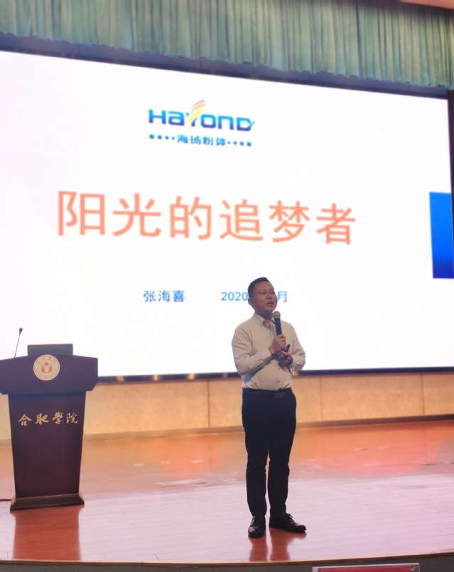 童玉松在開(kāi)場(chǎng)致辭中代表學(xué)校歡迎優(yōu)秀校友張海喜返校,他指出,“成功者的路,都是在感天動(dòng)地的努力中,用汗水、智慧和堅(jiān)毅輔就的。”接下來(lái),作為深圳海揚(yáng)粉體科技有限公司創(chuàng)始人張海喜分享了畢業(yè)十余年創(chuàng)業(yè)歷程。他談到其中的每個(gè)時(shí)間段都是成功路上的里程碑,記錄著他的青春奮斗史。而這些例子也激勵(lì)著學(xué)生們?nèi)ビ赂易穳?mèng)。不僅如此,他還向同學(xué)們講述自己艱難徒步沙漠,爬雪山最終抵達(dá)終點(diǎn)的經(jīng)歷,并對(duì)此抒發(fā)的自己的感想。他指出,創(chuàng)業(yè)的過(guò)程并不是一帆風(fēng)順,多年以來(lái)積累的資產(chǎn)曾因一場(chǎng)臺(tái)風(fēng)損失慘重,面對(duì)這次沉重的打擊,他并沒(méi)有選擇放棄,而是繼續(xù)尋找出路,最終以鳳凰涅槃的姿態(tài)迎來(lái)公司更好的發(fā)展。最后,張海喜表達(dá)了自己對(duì)新一代創(chuàng)業(yè)者的鼓勵(lì)和期望。