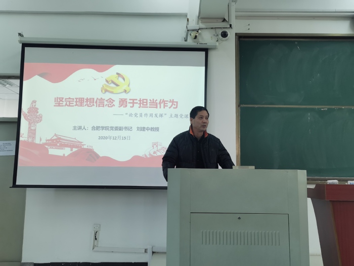 12月15日下午,在37棟1階梯教室,校黨委副書記劉建中教授以“堅定理想信念,勇于擔當作為”為主題,為材化學院全體學生黨員帶來了一場精彩生動的黨課,材化學院黨委書記童玉松主持。