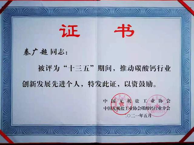 2021年5月,秦教授還在全國碳酸鈣行業年會上獲得“十三五”期間碳酸鈣行業創新發展先進個人稱號。