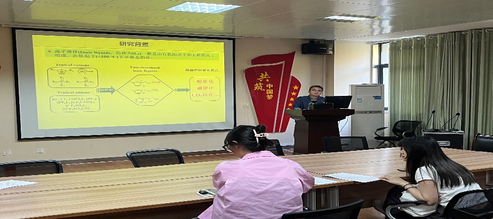 王老師首先從研究背景開始,為大家介紹了離子液體的組成以及離子液體催化不足的解決方法,而后詳細論述了這類材料的制備和性能。他強調多孔材料具有孔隙大小和分布的可調控性,因而適用于多種化學反應。同時,這類材料的高穩定性有助于在多種反應條件下提供可靠的催化效果。王老師還介紹了離子液體衍生的多孔催化材料在催化生物柴油制備、清潔能源生產、廢水處理、有機合成等多個領域的應用。最后,王老師對報告進行了總結,本院師生和王老師進行了互動交流,報告在全體師生的掌聲中落下為帷幕。