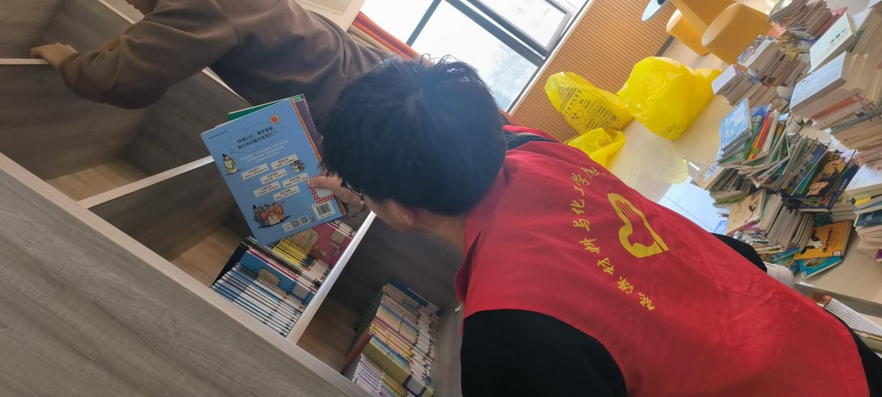 在本次志愿活動中,志愿者們主要對兩千余本書進行分類編號并將其按照編號有序放置在書架上。志愿者們首先將書分為有助于兒童學習成長的兒童讀物、富有內涵開闊視野的文學讀物,方便社區群眾生活的生活類書籍以及豐富精神信仰的紅色讀物。志愿者們精心整理著每一本圖書,清理圖書封面上的灰塵,按照類別整齊擺放在書架上。