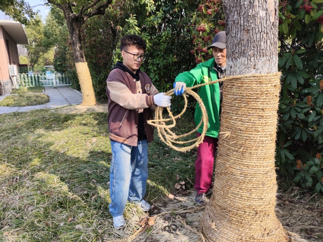 活動伊始,在公園管理處工作人員的安排下,園林工作人員對同學們進行了簡單的培訓,演示大樹“脫衣”過程,講解技巧與細節。學生黨員們積極熱情地投入勞動中,耐心解開防風麻繩,收拾整齊,以便日后回收利用。遇到粗壯的大樹,學生們兩兩配合,經過幾個小時的努力,志愿者們終于完成了所有的任務。