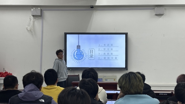 阮志鵬同學從生活、學習、實踐三個方面向同學們介紹了大學期間有效的學習方法,同時向大家分享了自己對建筑學專業的認識和理解,鼓勵大家要主動掌握建筑學相關知識,充實自身,奮發向上。此外,他還介紹了考研備考經驗、個人感受以及如何緩解考研壓力,鼓勵學弟學妹們要樹立考研的信心。最后,他表示希望個人的學習經歷和經驗,能幫助學弟學妹們解決學習生活中遇到的現實問題,更加順利地完成學業。