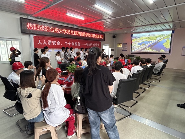 上午9時30分,師生們抵達項目部會議室,首先觀看了項目部精心制作的宣傳視頻。視頻詳細介紹了淮南路涉鐵項目的工程概況、建設進度、技術創新等內容,讓同學們對項目有了初步的了解。