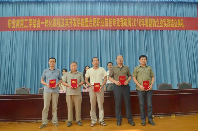 8月16日,職業教育及其工學結合一體化課程及其開發講座暨合肥職業院校專業課教師2016年暑期到企業實踐活動結業典禮在我校圖書館A報告廳順利舉行。此次活動得到了來自教育局、各企業及學校的大力支持,活動前期企業安排了形式多樣的實踐學習實踐、調研總結。經綜合考核,203名學員順利結業,42人被評為優秀學員。合肥職業院校教師能力發展中心執行主任高艷、副主任陳國剛、北京師范大學莊榕霞教授等出席結業典禮,典禮由陳國剛主持。  會上,莊榕霞作職業教育及其工學結合一體化課程及其開發講座,她從職業教育的本質特征和當代職業教育最重要的學習理論出發,就綜合職業能力發展的培養目標、學習領域課程模式、工作過程的職業資格研究、學習情境的設計、行動導向的教學等五個方面系統闡述了工作結合一體化課程開發的理論基礎和開發方法。  會上播放了記錄短片,回顧了合肥職業院校專業課教師2016年暑期到企業實踐活動。在結業典禮中,合肥職業院校教師能力發展中心吳燕作暑期到企業實踐活動總結,她匯報了合肥職業院校專業課教師2016年暑期到企業實踐活動組織、安排、開展及遇到問題等相關情況。合肥職業技術學院范家茂作為優秀學員代表發言,他表示到企業實踐是一次難得的機會,是一個很好的學習交流的平臺,通過實踐增強了責任感,更新了認識,找出了在教學理念等方面存在的不足。 隨后,高艷、陳國剛等為學員代表頒發了結業證書、優秀學員證書,并向學員們表示祝賀并發言。高艷指出,職業院校專業課教師到企業實踐活動是建設“雙師型”師資隊伍的要求,面對時間短、任務重、情況復雜等重多不可控因素,廣大教職工積極承擔社會責任,深入實踐,為建設合肥市現代職教體系做出應有貢獻。同時,今后合肥職業院校教師能力發展中心將進一步聽取各方意見,認真梳理總結,改正不足,力求進一步做好今后的到企業實踐活動。