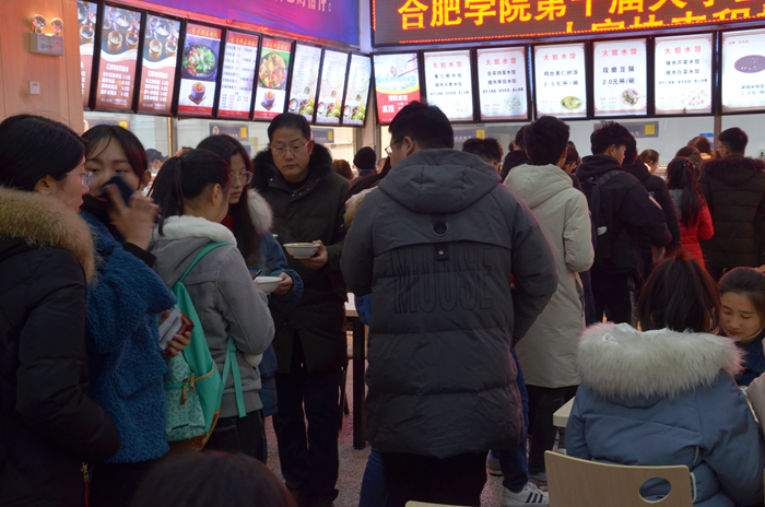 雖然正值春寒料峭之時,合肥學院的學子們卻早已來到校園投入到緊張的學習之中。臨近飯點,同學們開始大批涌入食堂。食堂不僅如往常一樣準備了豐盛的飯菜,還特地為同學們準備了免費的元宵湯。濃稠的白湯中翻滾著小元宵,飄散著一縷縷甜美的香氣。食堂就餐的人越來越多,元宵湯旁的隊伍也是越來越長,滿滿一大桶的元宵湯很快就見了底。有的同學們雖遠離家鄉不能同親人團聚,但這一碗小小的元宵湯足以慰藉游子的思念,讓同學們感受到溫暖。“在今天這一個特殊的日子,吃的不止是湯圓,更是過節的味道,而這樣充滿溫暖的元宵節,相信將來也會成為合院學子的獨特回憶”,一位正在排隊就餐的同學如是說道。第二食堂經理表示,食堂晚上準備了2000個湯圓,將免費提供給合院師生,送完為止。