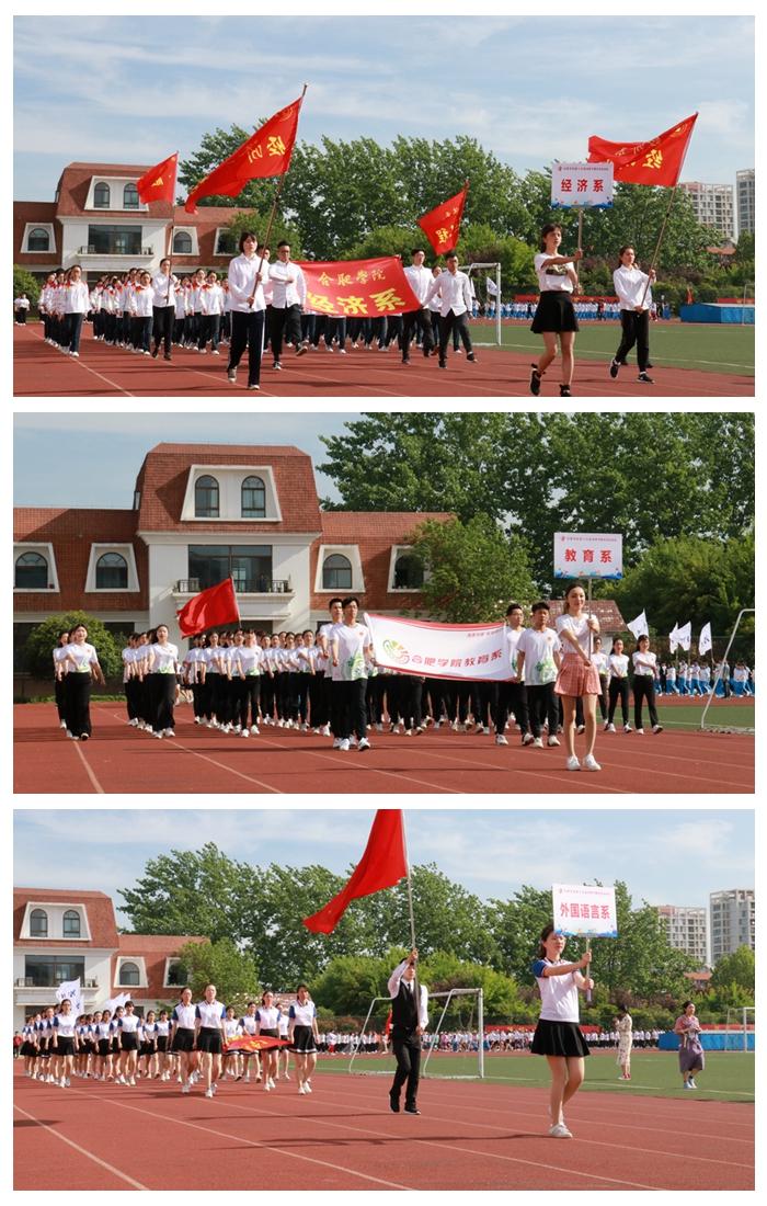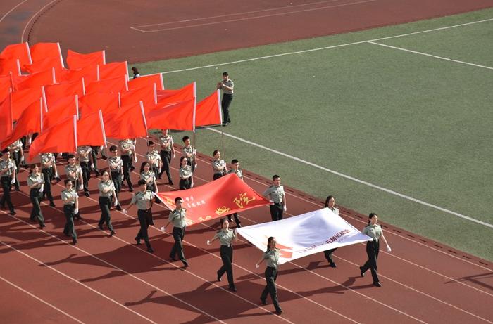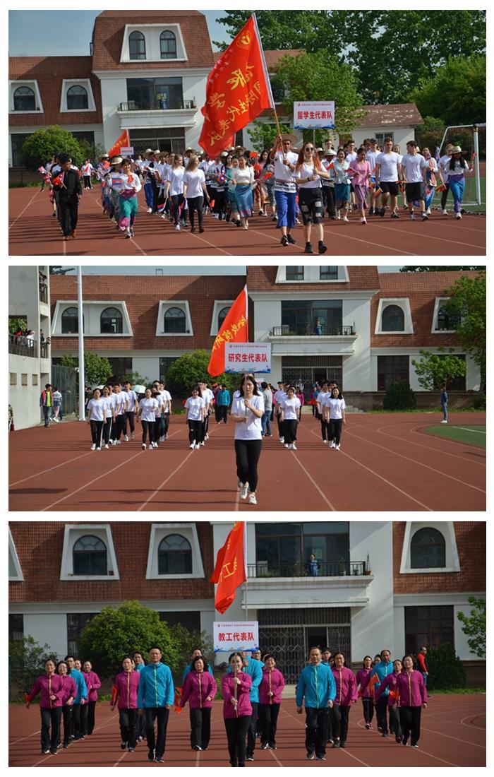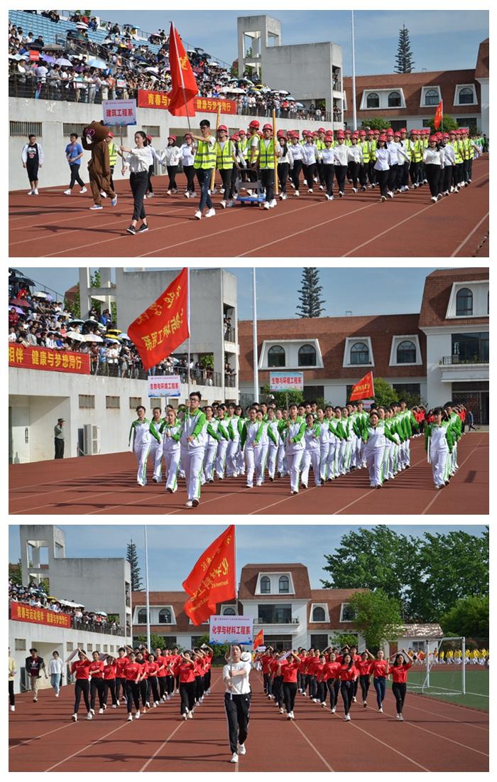 上午8時,現場工作井然有序地進行著,各代表隊嚴陣以待。伴隨著慷慨激昂的《運動員進行曲》,校國旗隊、十四個系方陣、留學生方陣、研究生代表隊和教職工代表隊邁著整齊的步伐依次走過主席臺。“建筑乘風,展翅騰空;揚我雄威,興我建工”,隨著鏗鏘有力的口號聲響起,戴著紅色建筑安全帽的建筑工程系方陣隊閃耀亮相;生物與環境工程系方陣隊員胸前遒勁的綠竹代表著他們勢如破竹、凌云賽場的昂揚斗志;中國語言文學系方陣的領隊身著漢服,展現了他們博古通今的獨特風采……嘹亮的口號,整齊的著裝,富有特點的隊形設計展現著合院師生團結自強、拼搏向上的精神風貌。