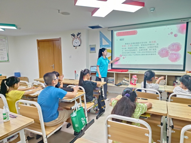 中國戲曲作為民族藝術,是我國優秀傳統文化的重要組成部分,也是文化自信的來源之一。 7月7日上午,合肥學院教育學院“七彩童年,‘育’你相伴”志愿團隊來到濱湖和園社區開展社會實踐活動,志愿者張曉潔和尹冰清共同為孩子們帶來一堂以“文化傳承”為主題的戲曲課堂。 “為救李郎離家園,誰料皇榜中狀元……”教室里傳出黃梅戲的優美旋律,孩子們陶醉在美妙的音樂聲中,情不自禁地跟著哼唱。一曲完畢,張曉潔老師向孩子們講述了黃梅戲的發展歷程、代表人物、主要角色以及戲曲的唱腔技巧、面部表現及發聲用力等。 不聞不若聞之,聞之不若見之,見之不若知之,知之不若行之。只是簡單地了解黃梅戲的相關知識是遠遠不夠的,張曉潔老師還帶領孩子們一起學唱戲曲——《天仙配》。臺上的老師教得認真,唱得精彩,臺下的學生學得認真,聽得陶醉,悠揚的黃梅雅韻也不時贏得孩子們的熱烈掌聲和大聲喝彩。戲曲為師生們打開了探索傳統文化之美的大門,傳播了國粹文化,增強了孩子們對傳統文化的認同感與歸屬感。為了進一步激發孩子們的學習熱情,張曉潔老師還采用了小組PK唱戲曲的模式,講臺上的孩子們扮演著一男一女的角色唱著戲曲,偶爾還會擺手勢,增強表演效果,活動現場氣氛熱烈,孩子們熱情高漲,增加了他們對戲曲的喜愛。 沉醉百年采茶調,衣襟總帶黃梅香,黃梅戲作為國家級非物質文化遺產,是一種無形的歷史文化遺產和中國優秀傳統文化的瑰寶,本次社會實踐活動也以“文化傳承”為主題,通過巧借傳統戲曲魅力,拉近孩子們與戲曲的距離。該活動也是貫徹落實德智體美勞“五大行動”的重要舉措,是實施美育熏陶、傳承地方傳統文化的有效途徑,不僅促進了藝術發展,弘揚了民族文化,增強了文化自信,也激勵著孩子們努力學習傳統文化知識,爭做文化傳承的接班人!(撰稿人:周琴,審稿人:張弦樂) |