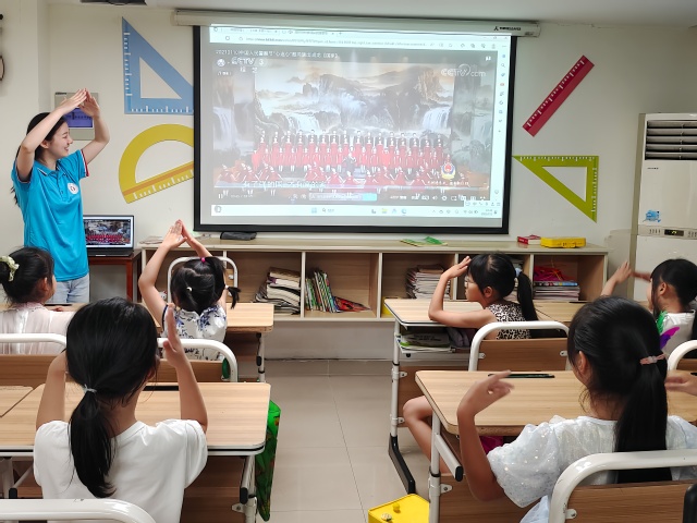 7月5日上午,合肥學院教育學院“七彩童年,‘育’你相伴”志愿團隊前往合肥市包河區濱湖和園社區開展“三下鄉”社會實踐活動。為讓同學們了解并學習手語,王玉、楊明月兩位志愿者為同學們帶來《國家》這首歌曲的手語舞蹈課。 學習手語是為了讓同學們更好地了解聾啞人這個特殊群體,帶領他們走近無聲的世界,從而在他們的心中播下善良友愛的種子。同學們高高舉起的小手滿載著她們對手語學習的渴望。在一片歡聲笑語中,同學們和志愿者一道踩著老師的節拍,手指在空中畫出完美的弧線,勾勒出愛的輪廓。當成龍演唱的《國家》音樂響起,同學們一個個坐得端端正正,視頻中歌曲與手語完美結合,同學們看得如癡如醉,并情不自禁地隨著視頻一起舞動起來。 手語是一種感情的溝通,心靈的釋放,為特殊人士與世界的交流架起一座心靈的橋梁,緊緊連接著彼岸的人們。志愿者望向同學們,面帶微笑地講,“小朋友們,什么是手語呀?”聽到老師的問題,一個小朋友快速地舉起了小手,“就是有些人聽不到講話,我們可以用手來表達給他,像這樣。”說著,他便舉起小手做了一個加油的動作。其他小朋友好奇地張望著,看來小朋友們都很感興趣。同學們全神貫注,目不轉睛地盯著老師的動作,生怕一個不留神就錯過了什么。當音樂響起,同學們馬上調整好狀態,臉上掛著甜甜的笑容,隨著音樂的節奏,小手在空中舞動,志愿者向他們豎起大拇指,課堂在熱烈的掌聲中落下了帷幕。 短短的一節手語課,卻給孩子們心中扎下了深深的根。課程結束后,他們仍意猶未盡,追著志愿者說,“我想學會更多手語來更好地幫助他們。”這是其中一個小朋友的心聲。有的學生甚至當起了小老師,帶領大家一起學習其他的手語。善良友愛的種子悄然在同學們的心中種下。 習近平總書記講到:培養和弘揚社會主義核心價值觀要從娃娃抓起。從小教育同學們學習手語能夠幫助聾人更好地融入社會,同時埋下友善待人的種子。手語用身體的動作傳遞出語言無法表達的感情,生發出同學們對特殊人士的尊重與關愛,讓特殊人士真正地感受到人間關愛。 流暢的動作,恰到好處的音樂,使他們真正地融入其中,仿佛進入一個新的世界。志愿者在課堂中將特殊交流以舞蹈的形式展現出來,聚精會神的眼神,翩翩舞動的雙手,詮釋著同學們對手語學習的渴望,在他們心中含苞待放的友愛之花也悄然盛開。(撰稿人:彭啟月,審核人:張弦樂) |