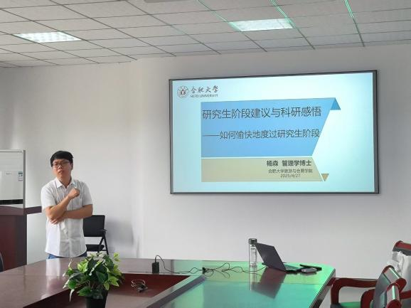 2025年4月27日下午16:00,由合肥大學(xué)研究生處、科研處主辦,旅游與會(huì)展學(xué)院承辦的研究生學(xué)術(shù)沙龍系列講座于合肥大學(xué)一期2棟226會(huì)議室順利開展。旅游與會(huì)展學(xué)院專任教師楊森博士以“研究生階段建議與科研感悟——如何愉快地度過(guò)研究生階段”為主題進(jìn)行分享交流。