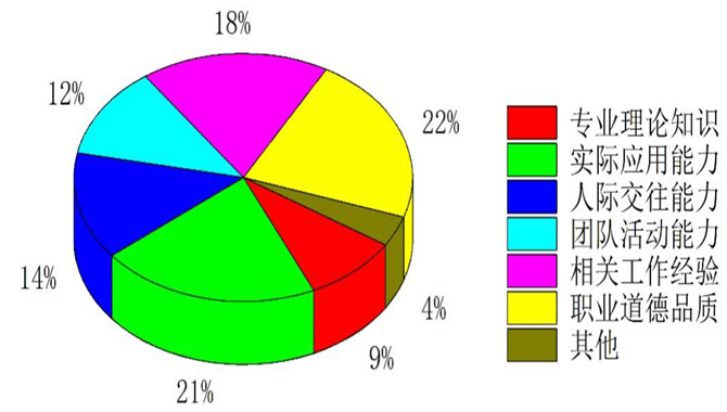 從相關培養能力要素上來看,用人單位更注重實際應用能力和職業道德品質培養,兩者所占比例最多。