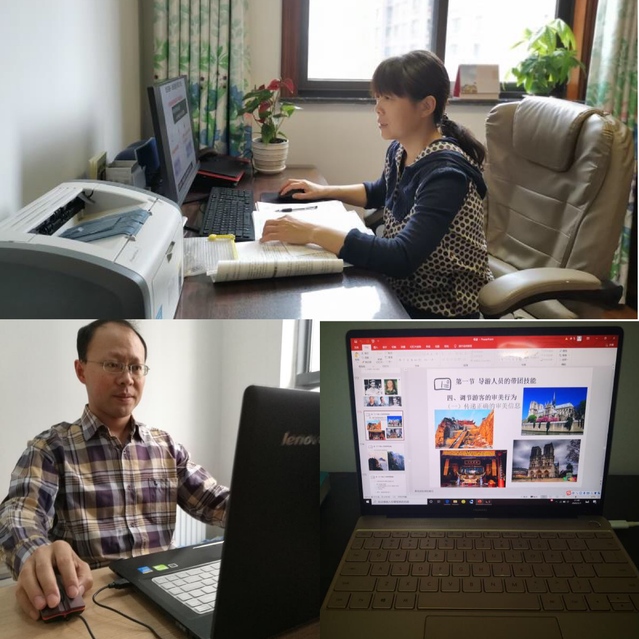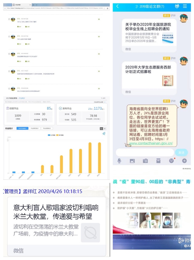 首先,積極參加線上教學(xué)培訓(xùn),積極探索與線上教學(xué)契合的課程內(nèi)容設(shè)置、教學(xué)方法設(shè)計(jì)、教學(xué)環(huán)節(jié)安排等。教師們把專業(yè)教學(xué)與抗“疫”斗爭結(jié)合起來,將課程思政融入課堂,鼓勵學(xué)生堅(jiān)定戰(zhàn)勝疫情的信心與決心。孟祥紅老師結(jié)合目前疫情對全世界旅游業(yè)的影響、世界名勝的現(xiàn)狀等激發(fā)學(xué)生的好奇心和對美好事物的渴望,高騰老師在教學(xué)內(nèi)容中增加新冠肺炎疫情對文旅企業(yè)的影響、鼓勵學(xué)生將課程知識應(yīng)用到幫助文旅企業(yè)復(fù)蘇的實(shí)踐中。