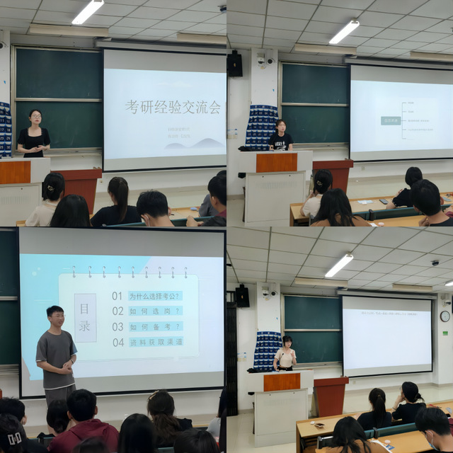 首先張羽婷學姐先就考研的動機與同學們進行了交流,她在考研的心態和小技巧方面給了同學們許多建議。接著毛悅悅學姐在各個學科的具體學習中分享了經驗和方法,在專業課學習背誦提出了細致的學習思路。萬宗潤學長給大家介紹了考公的報名情況和報名時機,激起同學們的興趣和好奇心。最后,蔡永婷學姐詳細分享了考公全程備考技巧,希望通過科學高效的備考方法緩解同學們內心的焦慮情緒。