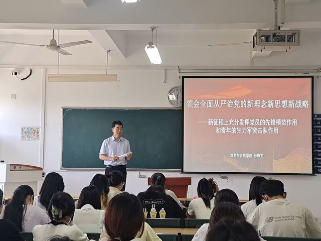 “中國共產黨人依靠學習走到今天,也必然依靠學習走向未來。”為深入推進學習貫徹習近平新時代中國特色社會主義思想主題教育,以學鑄魂、以學增智、以學正風、以學促干,發揮黨員先鋒模范作用,6月9日,旅游與會展學院開展學習貫徹習近平新時代中國特色社會主義思想主題教育黨組織書記專題黨課活動。旅游與會展學院黨委副書記、紀委書記孫靜宇以“領會全面從嚴治黨的新理念新思想新戰略”為題,為旅游與會展學院學生黨員上了一堂精彩的主題思想教育黨課。