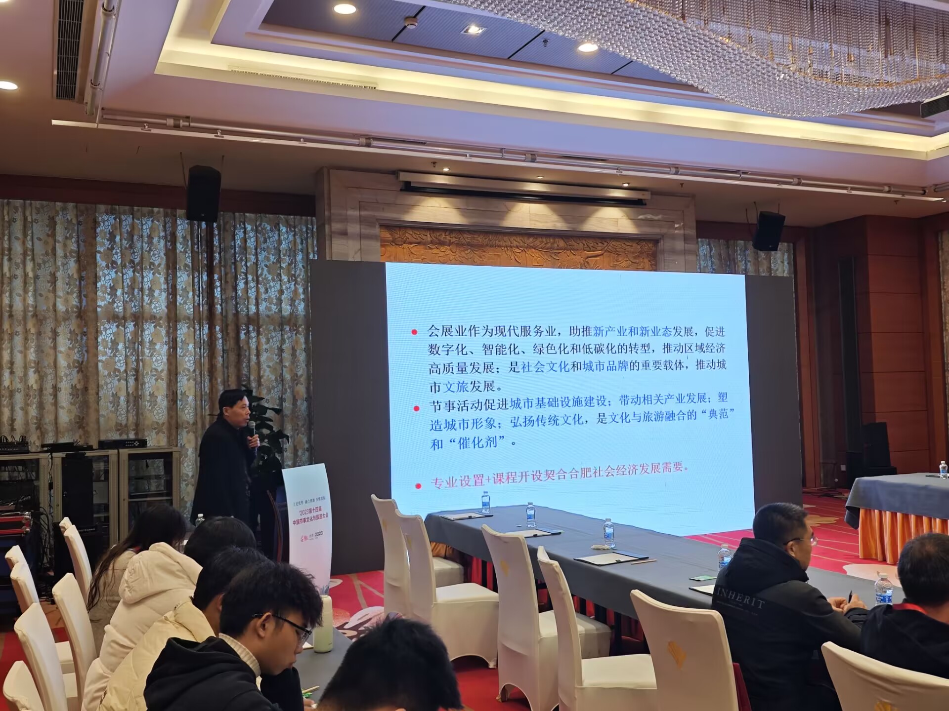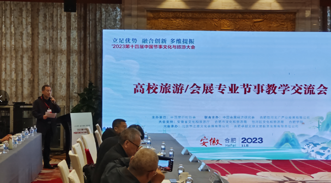 2023年第十四屆中國節事文化與旅游發展大會于11月17日至19日在合肥濱湖舉行,大會邀請到了全國約150個優秀節事品牌參加,旅游與會展學院應邀參加本次大會,學院部分老師和學生參加了分論壇和大會主會場會議。