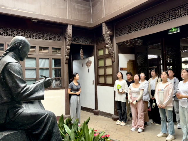 接下來,同學們來到吳昌碩修譜大屋,大屋門樓重檐斗拱,青磚雕成的四時花卉圖案,跨過門檻,淡淡的木質氣息撲面而來,瞬間將人拉進詩意盎然的年代,院內青石鋪就的小徑被歲月磨礪地光滑如鏡,古樸的窗欞雕刻精細的花紋,陽光透過縫隙灑下斑駁的光影,為靜謐的空間增添幾分溫暖與生動,這里的一磚一瓦都訴說著歷史,引領同學們走向塵封的故事。