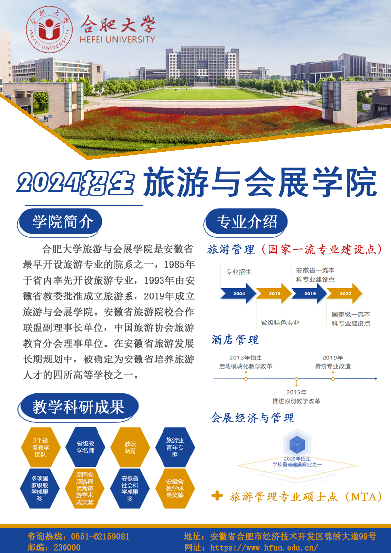 現開設旅游管理、酒店管理、會展經濟與管理三個本科專業和一個旅游管理專業碩士點(MTA)。學院實行小班化教學,精英化培養。其中,旅游管理專業2004年本科專業招生,2013年入選安徽省省級特色專業,2020年成為安徽省一流本科專業建設點,2022年成為國家級一流專業建設點。酒店管理專業本科專業于2013年招生,同時啟動模塊化教學改革,2015年推進雙創教學改革。會展經濟與管理專業為適應現代會展經濟發展所開設的新專業,于2020年秋季首次招生,是學校重點建設專業之一。本科、碩士面向海內外招生,已成為旅游人才培養的重要搖籃。