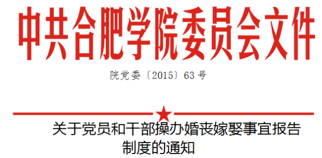 五、黨員和干部操辦婚事應(yīng)提前10天向相關(guān)部門報告,說明操辦事宜、時間、地點,邀請人數(shù)及范圍等情況,承諾遵守相關(guān)紀(jì)律,填寫《合肥學(xué)院操辦婚喪嫁娶事宜報告單》(見附件)。喪葬事宜應(yīng)在操辦時以口頭形式報告,事后15天內(nèi)補(bǔ)報《合肥學(xué)院操辦婚喪嫁娶事宜報告單》。