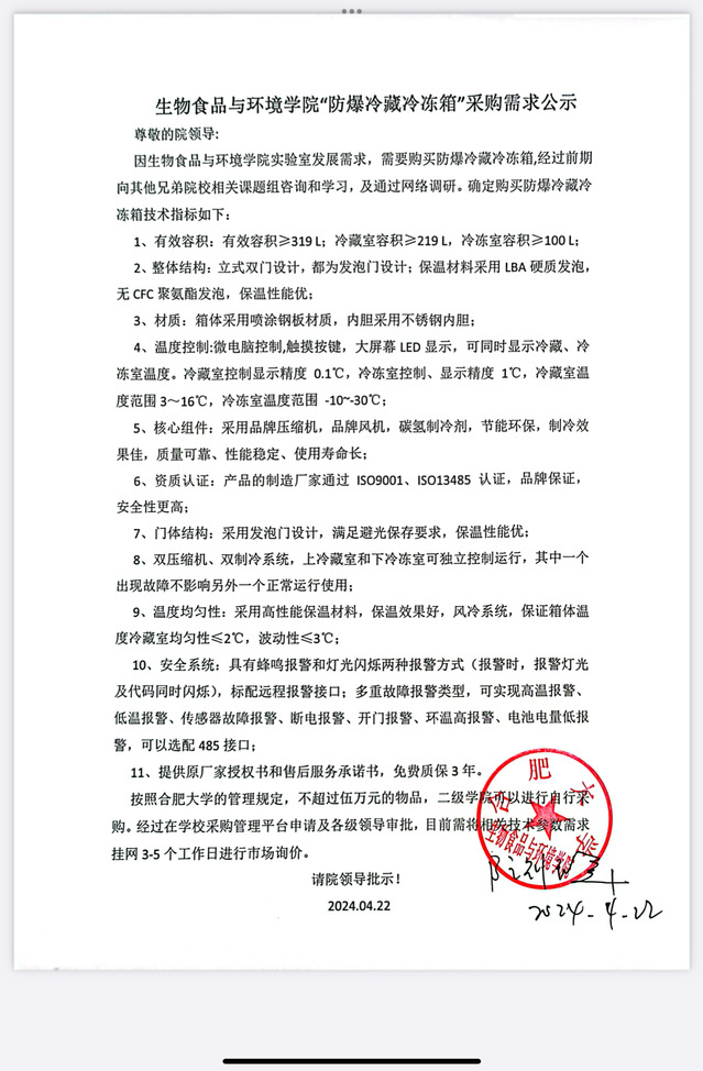 生物食品與環(huán)境學(xué)院“防爆冷藏冷凍箱”采購需求公示