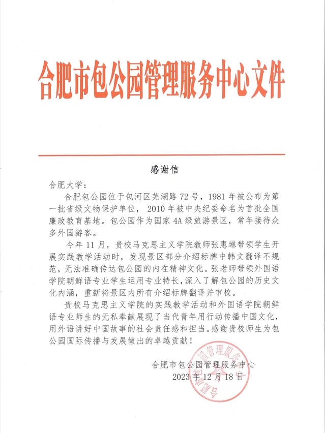 學生們通過此次活動,深刻感悟了包拯“孝忠、民本、剛正、清廉”的思想及中國傳統文化內涵,但同時發(fā)現景區(qū)部分介紹標牌外文翻譯不規(guī)范,無法準確傳達其內在的精神文化。教師在與景區(qū)管理服務中心溝通后,引導學生運用專業(yè)特長,以包公園的深厚歷史文化內涵為依托,重新將景區(qū)內所有介紹標牌翻譯并請專家審校。12月18日,合肥包公園管理服務中心向合肥大學發(fā)來感謝信,信中感謝馬克思主義學院的實踐教學活動和外國語學院朝鮮語專業(yè)師生的無私奉獻,贊揚我校師生用行動傳播中國文化,展現了當代青年用外語講好中國故事的社會責任感和擔當。