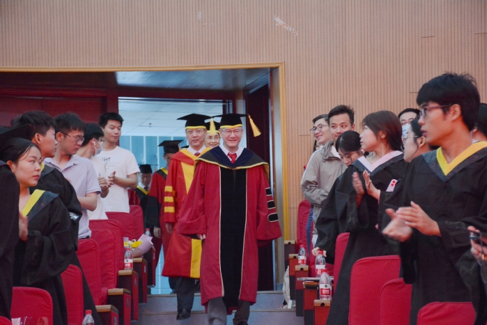 本科畢業(yè)生代表湯慶君、留學(xué)生畢業(yè)生代表鐘進意、研究生畢業(yè)生代表陸宏宇、研究生留學(xué)生代表尼德拉、教師代表胡坤宏教授相繼發(fā)言。湯慶君回顧了在大學(xué)四年里與同學(xué)、老師、合院相伴相成長的過程,她表示,會牢記國家和社會賦予的歷史使命,投身社會,奉獻(xiàn)青春,實現(xiàn)自我。鐘進意回憶并講述了他的中國故事、他的合院故事,并表示會讓更多的人了解中國,為中國和柬埔寨的友好交流貢獻(xiàn)自己的力量。陸宏宇回望三年研究生時光并對學(xué)校、老師和學(xué)校工作人員致以敬意,他說道:“三年1000多個日日夜夜的不懈拼搏與努力終于在2022風(fēng)吹麥浪的季節(jié)里結(jié)出了豐碩的果實。這些沉甸的收獲,寶貴的財富,無疑使我們在未來的學(xué)習(xí)、工作與生活中更多了一份信心和勇氣,助力我們成就更加精彩的人生。”尼德拉在發(fā)言中對給予他幫助與支持的同學(xué)、老師和家人表達(dá)真摯的感謝,在合肥學(xué)院,他感受到了家的溫暖。胡坤宏在發(fā)言中激勵畢業(yè)生繼續(xù)奮斗,勇攀科技文化高峰,為祖國建設(shè)奉獻(xiàn)力量,助推“中國夢”的實現(xiàn)。