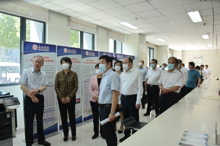在學生就業服務大廳,翁鐵慧一行深入了解學校“訪企拓崗”、“訪地拓崗”、就業幫扶、就業數據核查等工作開展情況。翁鐵慧對學校就業工作取得的成果表示認可,要求進一步加強就業數據核查,深入落實“一生一策”幫扶,推動畢業生更加充分更高質量就業。近年來,學校堅持以學生為中心,打造線上線下學生社區服務平臺,努力為學生提供流程簡化、便捷高效的服務。現場,翁鐵慧肯定了學校“一站式”學生服務平臺,希望學校進一步實現管理智能化、服務精準化,賦能大學生思想教育新生態。