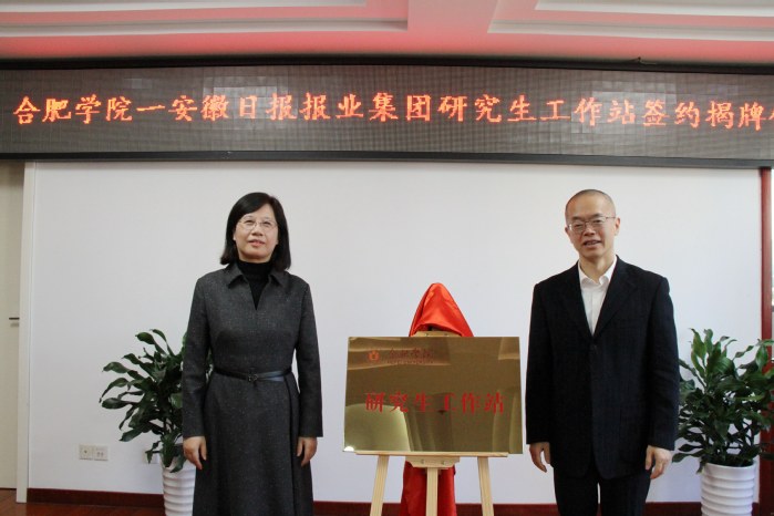 研究生處處長葛春梅與安徽日報報業(yè)集團(tuán)人事處處長張擎分別代表合作雙方簽署共建研究生工作站框架協(xié)議,吳春梅與范榮暉共同為研究生工作站揭牌。