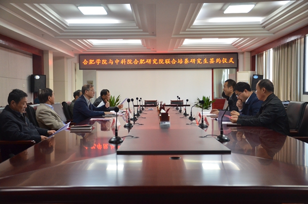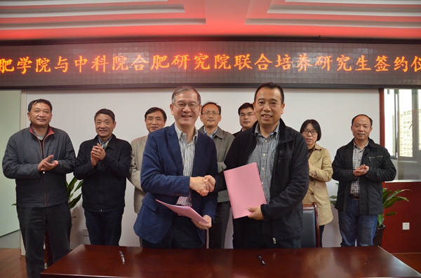 10月30日,中科院合肥研究院來訪我校,簽署聯合培養研究生協議并研討研究生聯合培養事宜。校長王其東于行政樓九樓東會議室會見了中科院合肥研究院副院長劉建國等一行人。合肥學院科技處處長吳克、研究生處處長伍德勤及系部主任陪同與會。伍德勤主持本次簽約儀式。