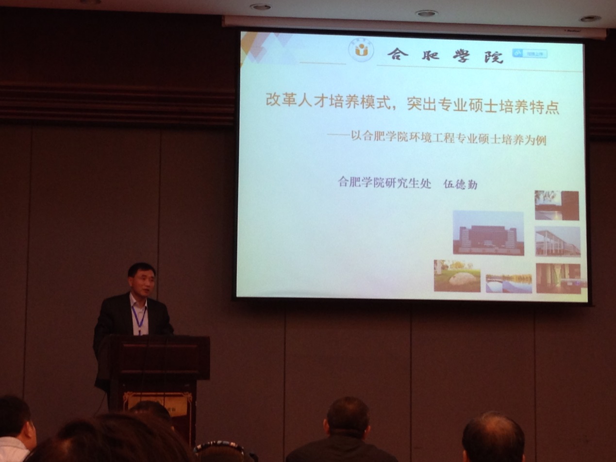 在第二天的分組交流和討論會(huì)上,來自浙江大學(xué)、電子科技大學(xué)、東南大學(xué)、西南交通大學(xué)等高校的16位代表在四個(gè)分會(huì)場(chǎng)做了專題報(bào)告,我校有幸作為試點(diǎn)高校唯一的代表被安排作專題交流。伍德勤處長以《改革人才培養(yǎng)模式,突出專業(yè)碩士培養(yǎng)特點(diǎn)——以合肥學(xué)院環(huán)境工程專業(yè)碩士培養(yǎng)為例》為題向與會(huì)代表介紹了我校環(huán)境工程專業(yè)碩士的培養(yǎng)特點(diǎn)以及遇到的問題,代表們很贊賞我校的一些做法,并就有關(guān)問題與伍處長進(jìn)行了交流。這次會(huì)議也給我們很多的啟示,不少大學(xué)專業(yè)碩士的培養(yǎng)經(jīng)驗(yàn)值得我們學(xué)習(xí)和借鑒。