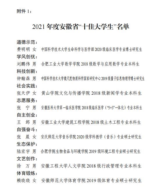 近日,由團省委、省委宣傳部、省文明辦、省教育廳等單位聯(lián)合開展的2021年度安徽省“‘十佳’‘百優(yōu)’大學(xué)生”選樹工作結(jié)果揭曉。我校生物食品與環(huán)境學(xué)院2019級環(huán)境工程專業(yè)碩士研究生陸宏宇獲2021年度安徽省“十佳大學(xué)生”稱號,全省僅10位學(xué)生獲此殊榮。