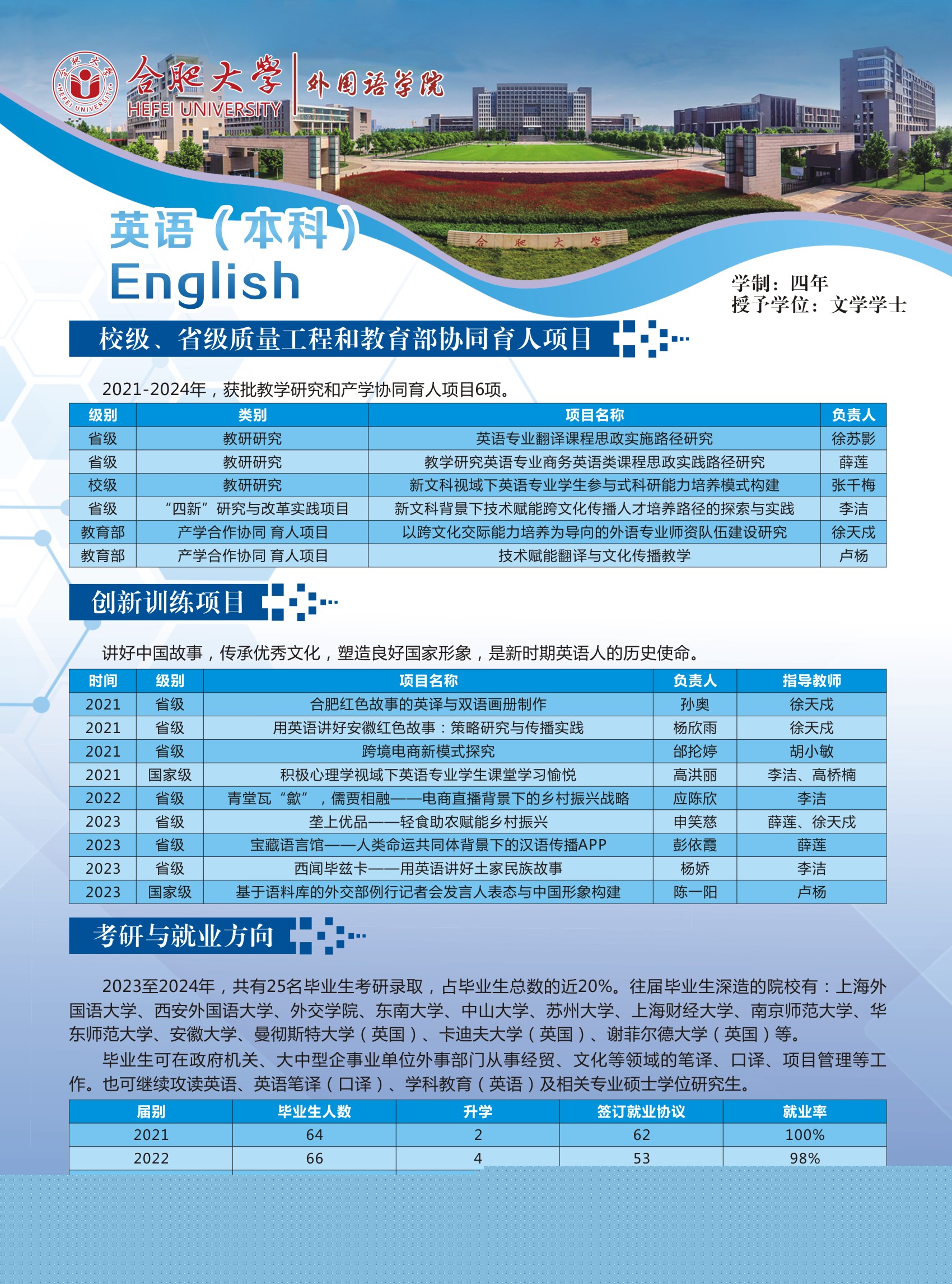 培養目標及特色:本專業培養德、智、體、美、勞全面發展,具有良好的綜合素質、扎實的英語語言基本功、較強的語言運用能力和應用翻譯能力、厚實的英語專業知識和必要的英語教育或商務英語專業知識與技能,能適應安徽、合肥與環巢湖地區區域經濟一體化發展和對外宣傳需要,可熟練使用英語從事涉外行業、語言服務行業和英語教育教學等項目管理、應用翻譯、教學等相關工作的具有較高跨文化傳播能力的復合型、應用型英語人才。本專業注重自主學習平臺建設,打造分層次的集中實踐和課內實踐教學體系,開拓應用能力培養的課內外輸出路徑,提升了學生講述中國故事、安徽和合肥外宣話語的寫作、演講、翻譯和闡釋能力。