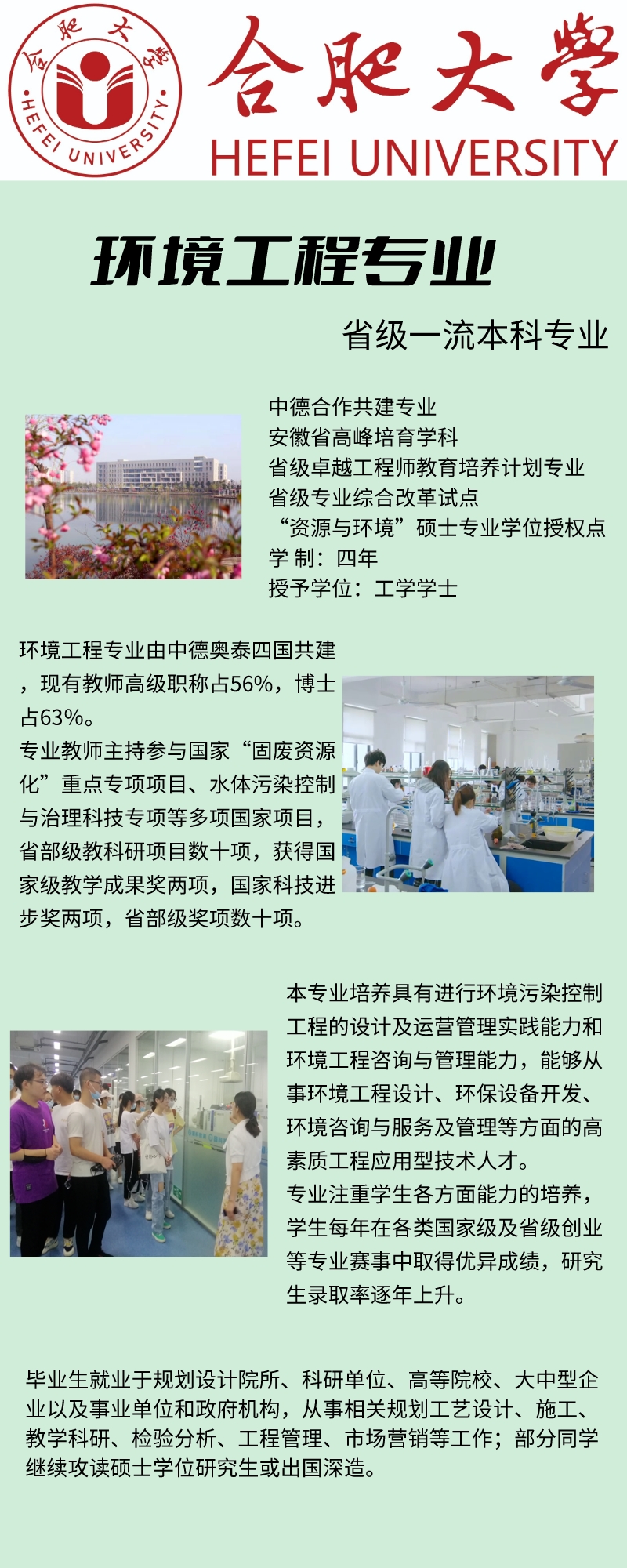 培養目標及特色:本專業培養德、智、體、美、勞全面發展,具備可持續發展理念及科學、工程素質與能力,具備水、氣、物理性、固體廢物等污染防治、環境評價與規劃、生態修復等專業知識的復合型人才;培養具有污染物控制工程設計及從事環境工程運營與管理等方面的能力,能在環境工程及相關領域第一線從事環境監測、設計、施工、管理、教育和研究等工作的應用型專門人才。