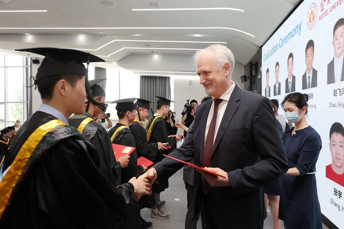 6月16日上午,我校和大眾集團合作培養的首批“種子工程師”順利畢業,校長吳春梅出席大眾安徽舉行的畢業典禮。大眾中國執行副總裁傅勤彥先生、大眾安徽首席執行官葛皖鏑博士、首席制造官施耐德先生、首席技術官呂爾曼博士、首席人力資源官邵劍先生以及校長辦公室、教務處、國際交流合作處、先進制造工程學院、人工智能與大數據學院相關領導和老師共同參加畢業典禮。