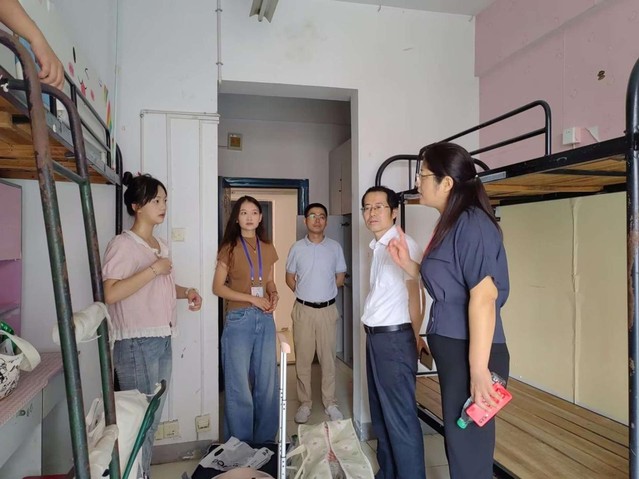 為全面了解2024級新生入學后的適應情況,幫助新生更好更快地融入新集體、新環境、新生活, 9月14號上午,學院黨委書記儲昭輝、院長丁增武、黨委副書記張愛萍、副院長殷明明、24級新生輔導員陳偉、學生第一黨支部書記竇思佳深入學生宿舍走訪慰問2024級語言文化與傳媒學院新生。