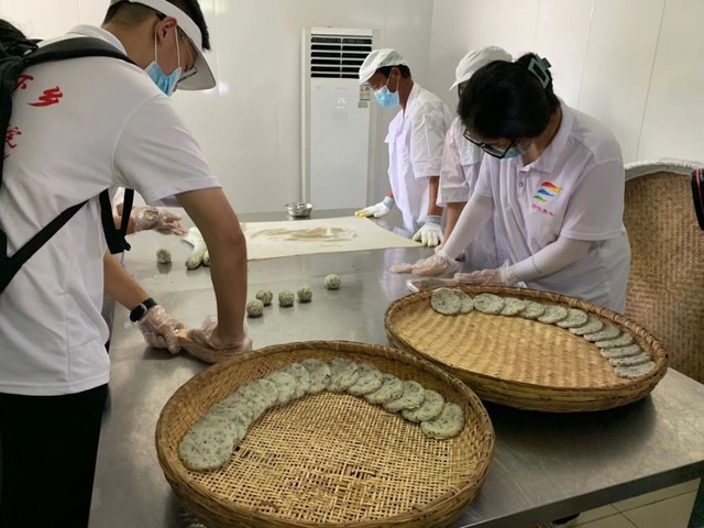 蒿子粑粑又稱清明餅、清明粿,是柿樹崗鄉當地的特色產業,歷史悠久,由于當地獨特的氣候條件十分適宜刺頭蒿生長,村民們便因地制宜,制作出了蒿子粑粑這一風味美食,并得到了當地政府的大力支持,從2016年開始每年4月都會舉辦“蒿子粑粑節”,吸引了各地的游客前來觀賞。調研組的成員跟隨著生產基地內講解員的腳步,對蒿子粑粑的生產工藝有了初步的了解,大家也在生產人員的指導下親手嘗試制作,從而近一步感受這份傳統工藝的無限魅力。