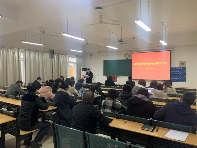 1129日下午,語言文化與傳媒學院在一區善思樓C305教室召開全體教職工大會,學院黨委書記儲昭輝、院長丁增武、黨委副書記張愛萍、副院長殷明明等學院領導和全體教職工出席會議,會議由黨委書記儲昭輝主持。