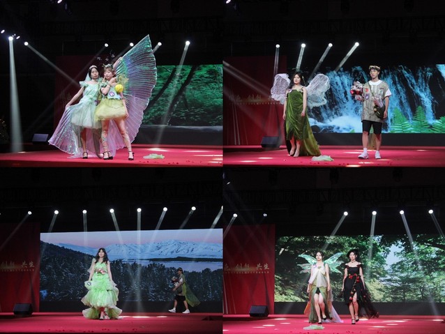 首先,由我校大學(xué)生藝術(shù)團(tuán)為大家傾情演唱一首《放飛夢(mèng)想》,此次比賽在優(yōu)美的歌聲中正式拉開(kāi)序幕。各院模特隊(duì)在本次比賽中以綠色環(huán)保為設(shè)計(jì)理念,運(yùn)用身邊日常用品作為服裝設(shè)計(jì)材料,為大家?guī)?lái)了一場(chǎng)精彩的表演,各有特色,各有千秋。其中,語(yǔ)言文化與傳媒學(xué)院模特隊(duì)以《綠野仙蹤,回歸自然》為主題,利用垃圾袋、紗、布、樹(shù)枝等來(lái)進(jìn)行服裝設(shè)計(jì),充分彰顯了環(huán)保的主題及時(shí)代特征。各位模特充滿自信的表演充分展現(xiàn)了我院學(xué)生的青春風(fēng)貌,體現(xiàn)了文化內(nèi)涵和民族特色。在場(chǎng)觀眾掌聲熱烈,對(duì)于模特們的表演驚嘆不止。最后,大學(xué)生藝術(shù)團(tuán)又為大家?guī)?lái)了《如果是+致姍姍來(lái)遲的你》的歌曲表演,本次比賽正式落下帷幕,觀眾們回味無(wú)窮。