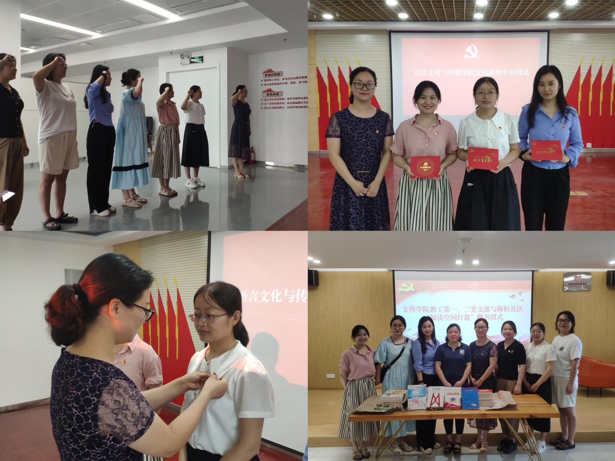 為慶祝中國共產(chǎn)黨成立102周年,增強黨性教育,7月4日下午,語言文化與傳媒學(xué)院教工第一、二黨支部前往海恒社區(qū)進行主題黨日活動。此次活動有兩項議程:一是在海恒社區(qū)進行閱讀推廣活動,二是為支部黨員過政治生日、重溫入黨誓詞。