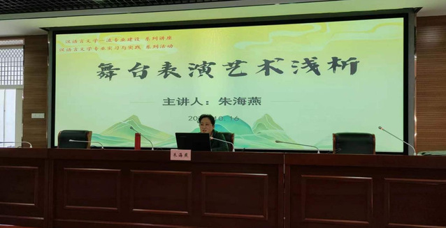 10月16日上午,語(yǔ)言文化與傳媒學(xué)院“漢語(yǔ)言文學(xué)一流專業(yè)建設(shè)系列講座”拉開帷幕。首場(chǎng)講座題為“舞臺(tái)表演藝術(shù)淺析”,特邀講座人是國(guó)家一級(jí)演員,文化部?jī)?yōu)秀專家、安徽省話劇院原院長(zhǎng)朱海燕。語(yǔ)言文化與傳媒學(xué)院副院長(zhǎng)殷明明,中文系師生100余人聆聽講座。