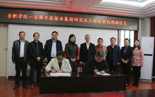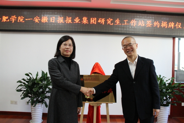 黨委研究生工作部部長、研究生處處長葛春梅與安徽日報報業集團人事處處長張擎分別代表合作雙方簽署共建研究生工作站框架協議,吳春梅與范榮暉共同為研究生工作站揭牌。