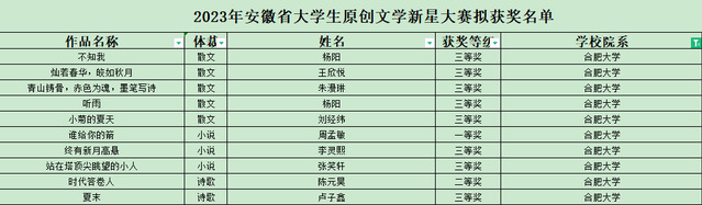 2023年安徽省大學生原創文學新星大賽擬獲獎名單于12月18日揭曉,合肥大學參賽選手喜獲佳績,包括一等獎1項,二等獎1項,三等獎8項。語言文化與傳媒學院李慶霞老師獲得優秀指導教師獎。
