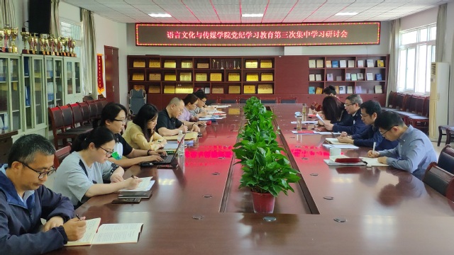 5月14日上午,語言文化與傳媒學院在一期五棟二樓會議室舉行黨紀學習教育第三次集中學習暨黨委理論學習中心組集中學習研討會。學院領導班子成員、黨委委員、紀委委員、科級干部及各黨支部書記、系(中心)主任參加會議,會議由院黨委書記儲昭輝主持。