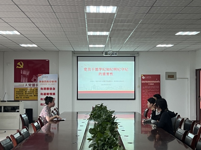 2024年6月13日下午,合肥大學語言文化與傳媒學院研究生黨支部在學院大會議室開展以“黨員干部學紀知紀明紀守紀的重要性”為主題的黨紀學習教育專題黨課。黨課由語言文化與傳媒學院副院長查金萍教授主講,研究生黨支部全體黨員參加。
